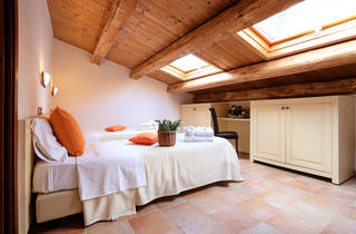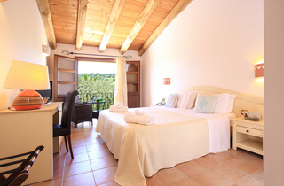 Deluxe Zimmer 23 m2 – 2-3 Pers. | im Erdgeschoss und im ersten Stock | französischen Balkon mit Blick auf das Tal und auf den Pool |emaillierte Terrakotta Fussböden und Decken mit Holzbalken|.