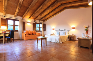 Suite - 30 m2 – 2-4 Pers. |aus einem einzigen Ambiente mit Doppelbett und ausziehbarer Couch |für Wohnzimmer |warme Fussböden aus emaillierter Terrakotta und eine durch Holzbalken verzierte Zimmerdecke |grosse Fenster und Blick auf das Tal und auf den Pool | 40 m² große Terrasse ausgestattet.