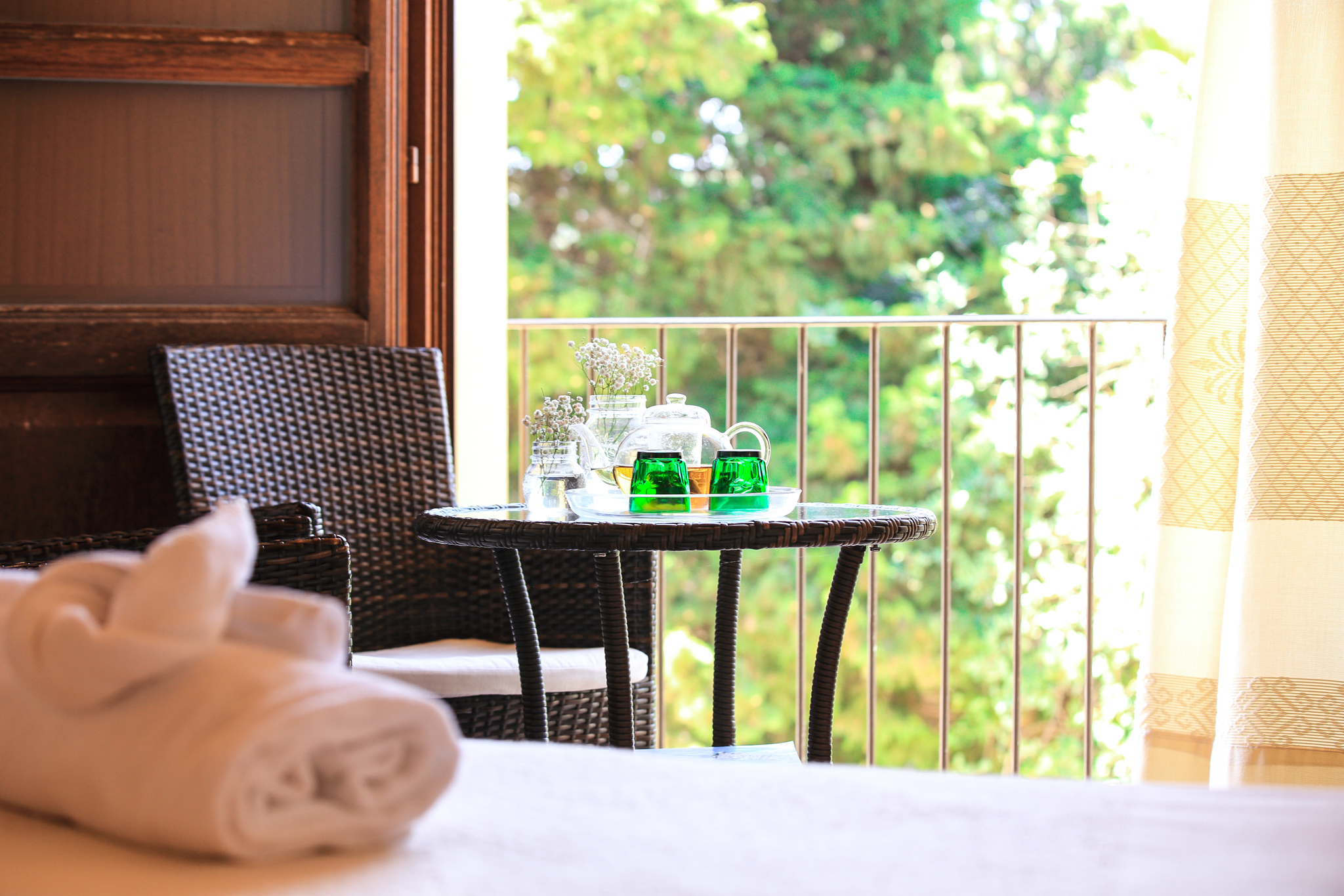 Deluxe Zimmer 23 m2 – 2-3 Pers. | im Erdgeschoss und im ersten Stock | französischen Balkon mit Blick auf das Tal und auf den Pool |emaillierte Terrakotta Fussböden und Decken mit Holzbalken|.