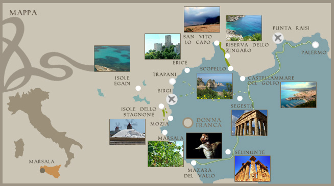 Besichtigung Weinkeller und Degustation Kochkurse Besichtigung der Salinen von Marsala und Trapani, Mozia Bootsausflug nach San Vito Lo Capo und die Egadi-Inseln Besichtigung des historischen Zentrums von Erice und der archäologischen Stätte von Marsa