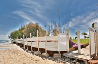 Strand Sandstrand | ausgestattet mit Liegestühlen, Sonnenschirme und Badetücher