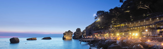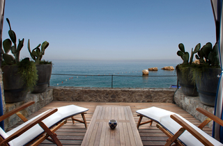 Strand Felsen | Sonnenterrasse ausgestattet mit Sonnenschirmen und Liegestühlen