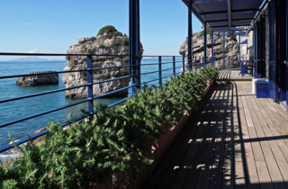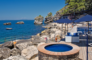 Strandservice Sonnenterrasse auf Felsen mit Pool und Jacuzzi ausgestattet mit Sonnenschirmen und Liegestühlen, Strandtuch
