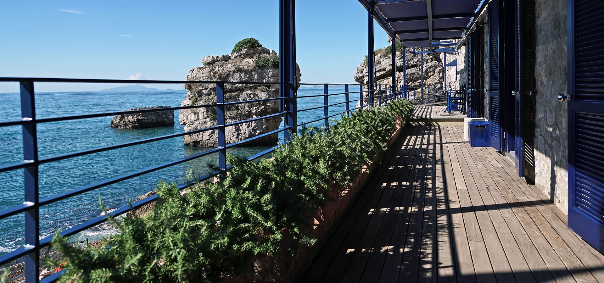 Strand Felsen | Sonnenterrasse ausgestattet mit Sonnenschirmen und Liegestühlen