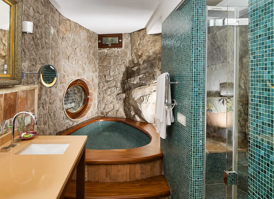 Zugang zum Strand | Bad mit runder Wanne und Fenster mit Meerblick | Nespresso Kaffeemaschine mit Auswahl an Kaffee und Tee.
