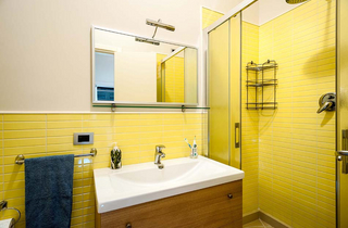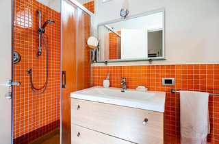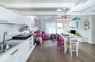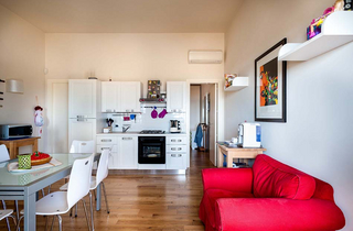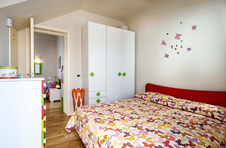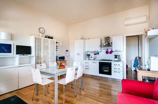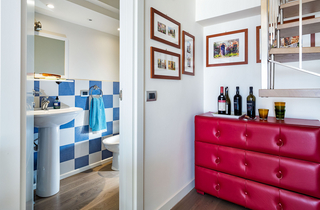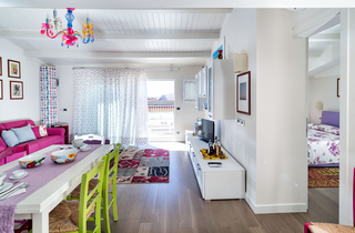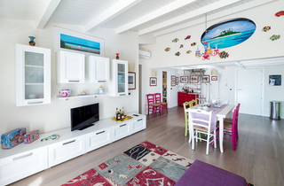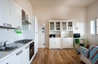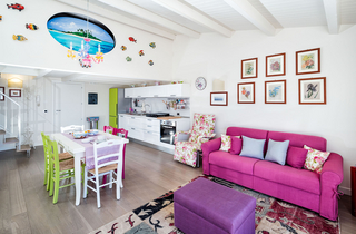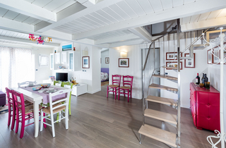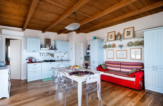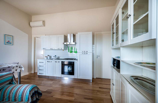 Im ersten Stock befindet sich das Apartment Onda, zu dem eine exklusive Panoramaterrasse, ein Wohnbereich mit Küche, zwei Schlafzimmer, von denen eines ein Durchgangszimmer ist und zwei Badezimmer gehören.