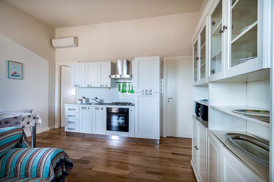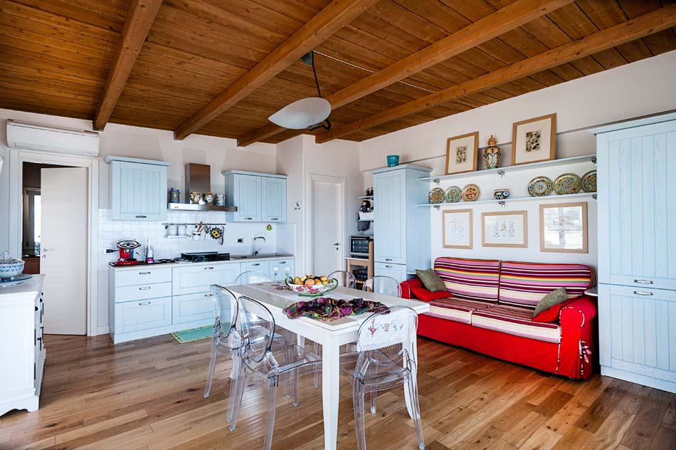 Die Apartments Timone und Vela befinden sich im Erdgeschoss und verfügen über einen Wohnbereich mit Küche, zwei Schlafzimmer, von denen eines ein Durchgangszimmer ist, und drei Badezimmer.