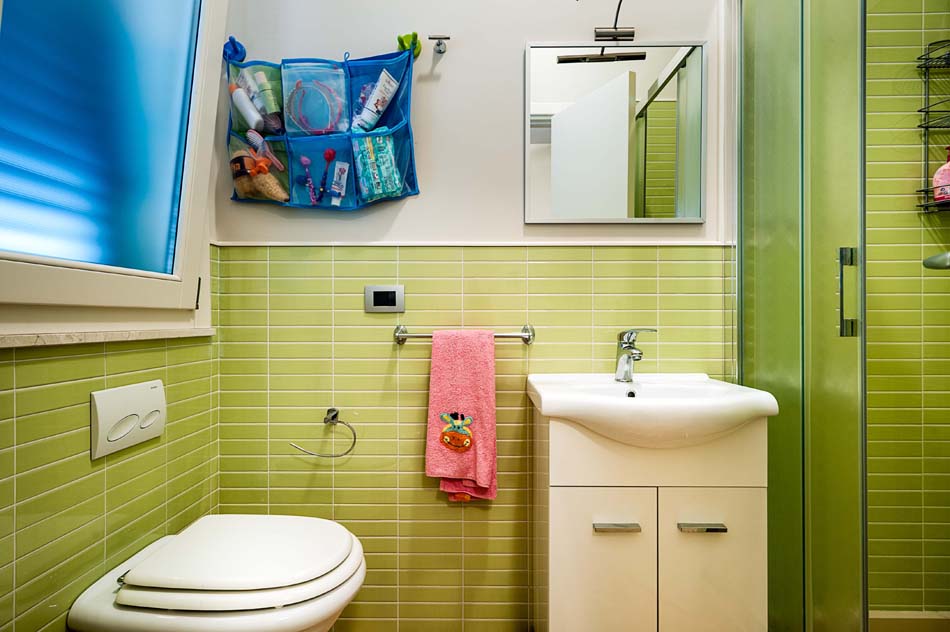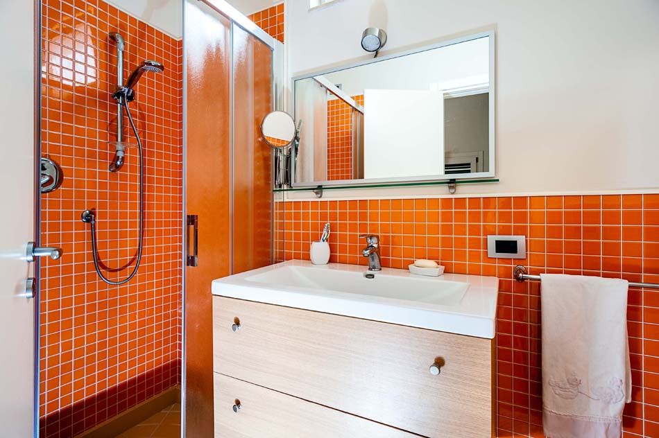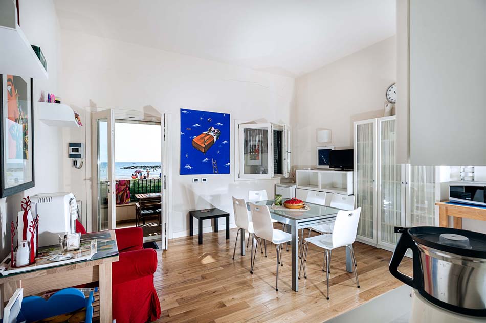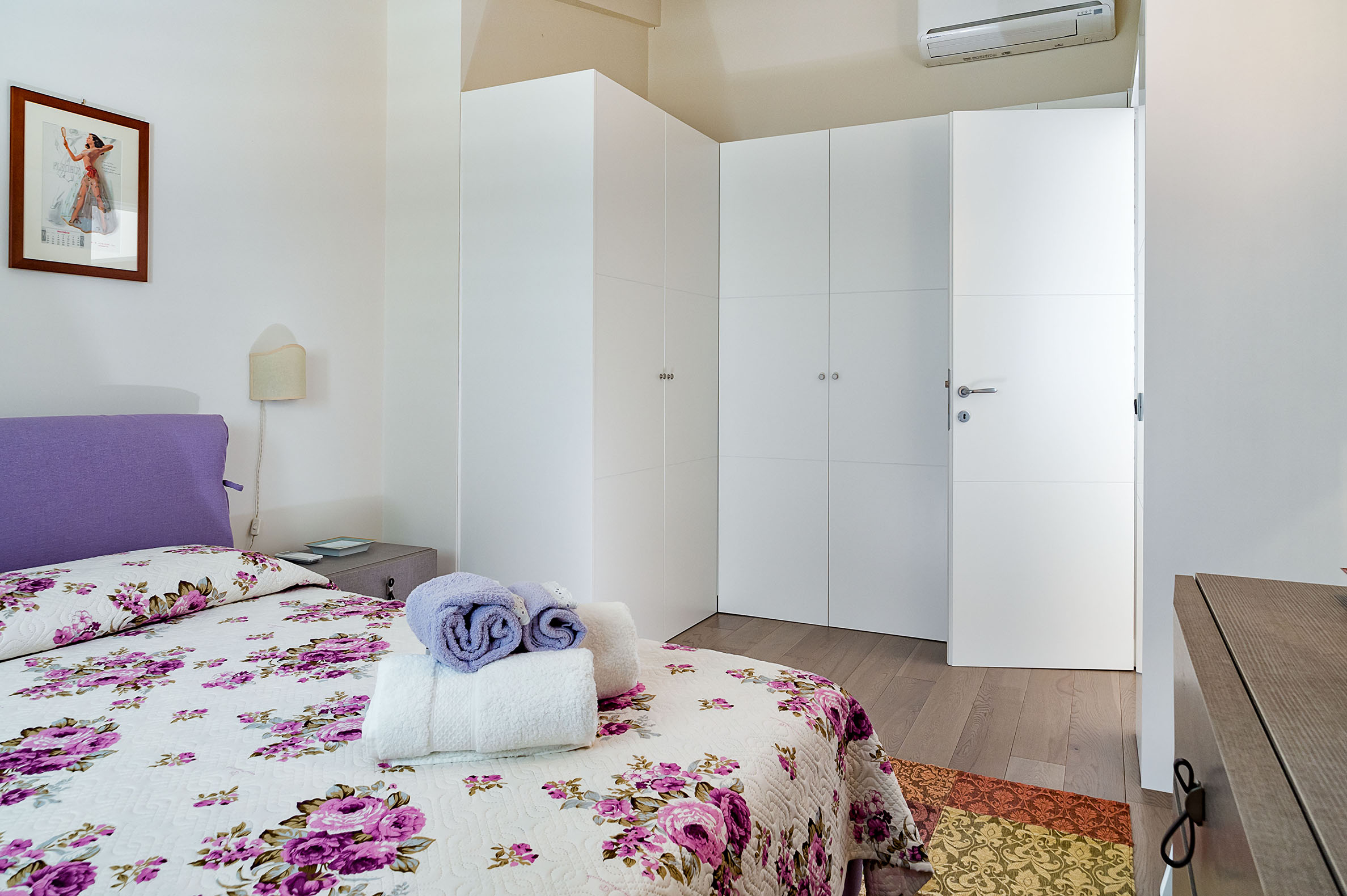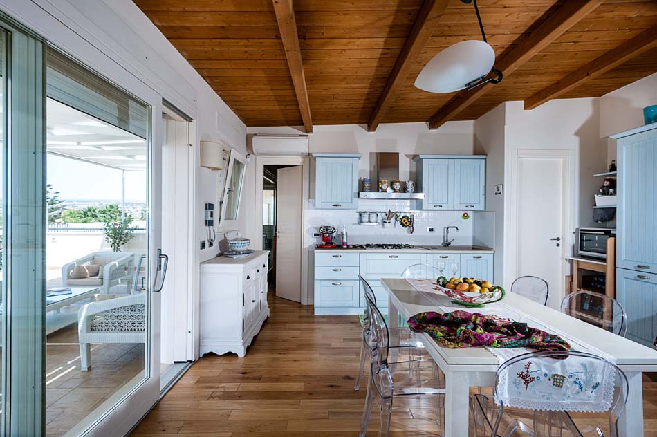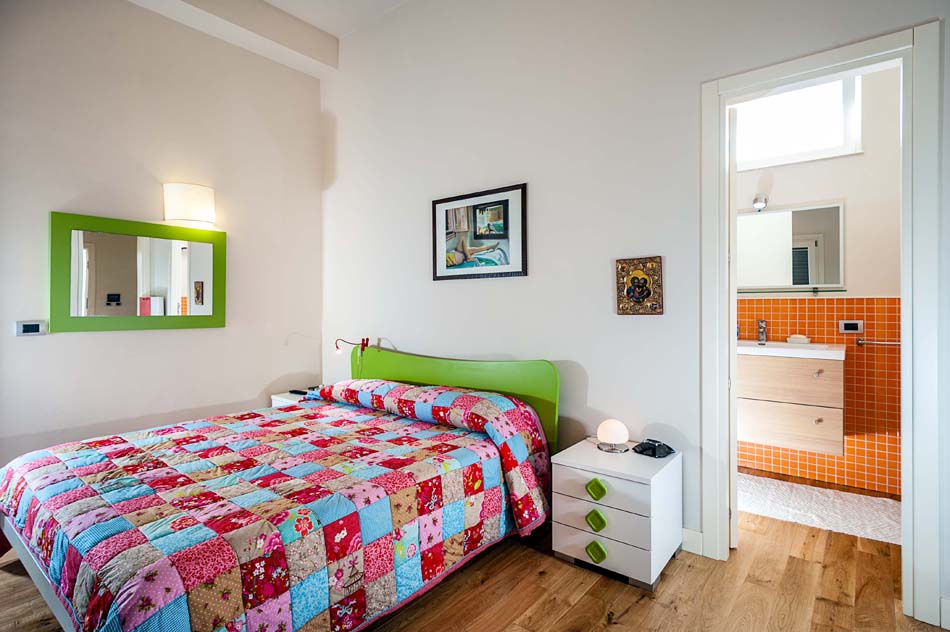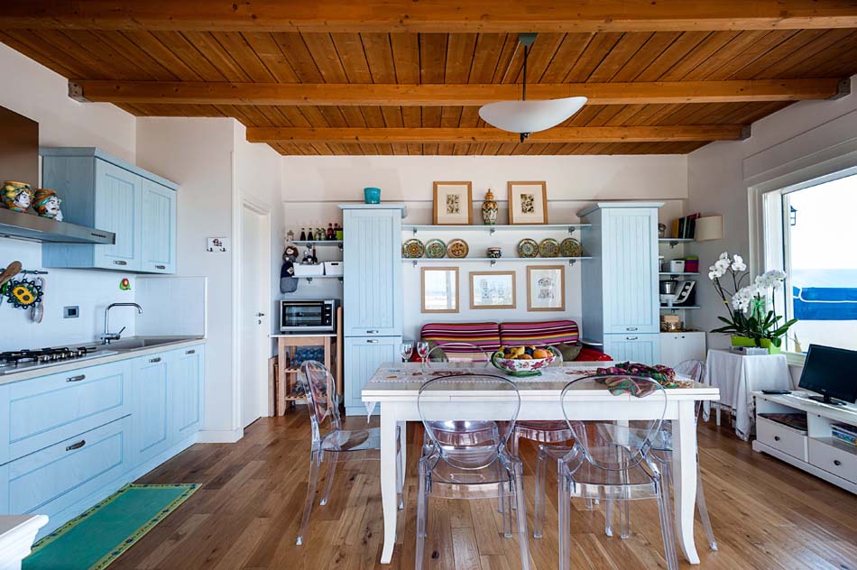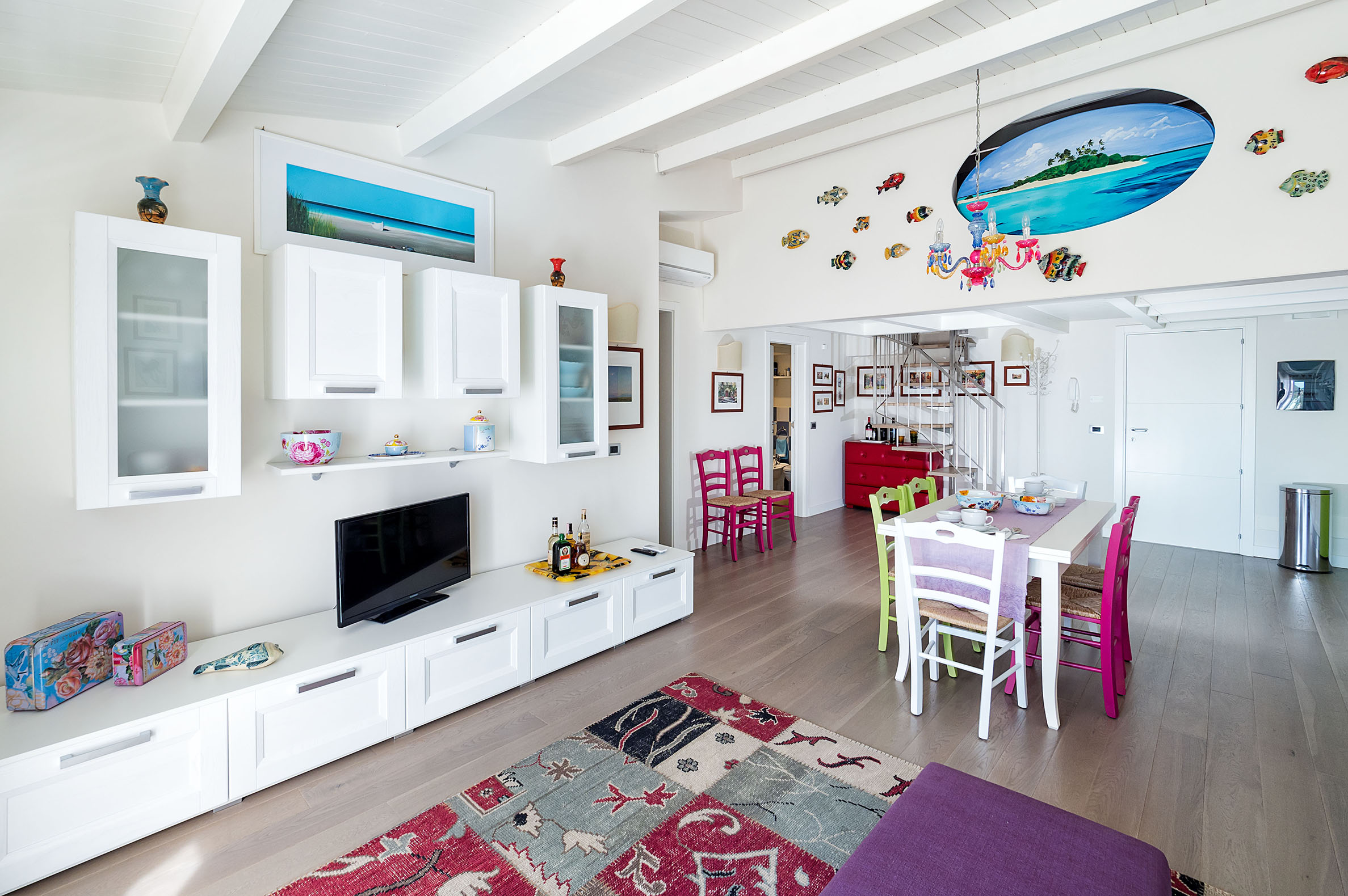 Im ersten Stock befindet sich das Apartment Onda, zu dem eine exklusive Panoramaterrasse, ein Wohnbereich mit Küche, zwei Schlafzimmer, von denen eines ein Durchgangszimmer ist und zwei Badezimmer gehören.