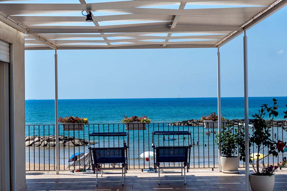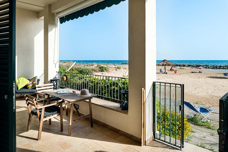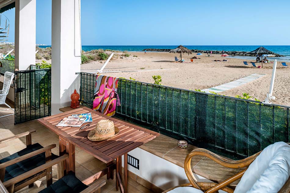 Die Apartments für jeweils vier Personen verfügen über einen direkten Zugang zum Strand und eine private Terrasse mit Meerblick. Auf der Rückseite der Villa gibt es auch eine grossee Terrasse, die von den Gästen geteilt wird und mit einer Aussenküche und einem Grill ausgestattet ist.