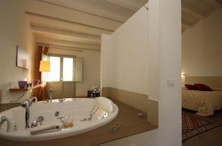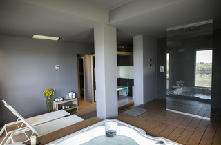 Suite im 1. Obergeschoss | offener Raum mit Doppelbett | Wohnraum mit Sofa | Bad mit Jacuzzi Badewanne | Balkon mit Blick auf die Landschaft und das Meer