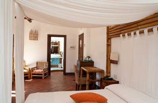 Zimmer 12 stilvoll eingerichtete Zimmer | Klimaanlage | TV | Telefon | Haartrockner | Minibar | Wasserkocher | Safe | Standard – im 1. oder 2. Stock | geräumig | ruhig | einige mit Meer- oder Gartensicht | teilweise mit Balkon | Juniorsuite - mit Himmelbett | Balkon | Badewanne | Deluxe Suite - mit grosser Terrasse | Sofas | Sonnenliegen