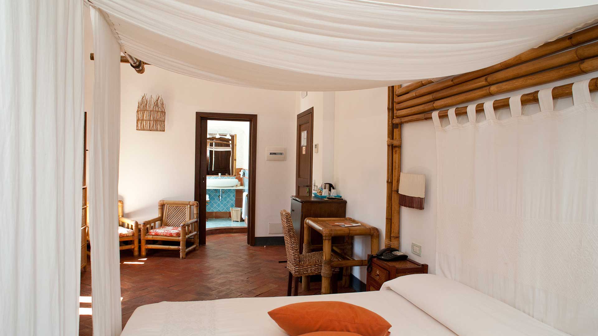 Zimmer 12 stilvoll eingerichtete Zimmer | Klimaanlage | TV | Telefon | Haartrockner | Minibar | Wasserkocher | Safe | Standard – im 1. oder 2. Stock | geräumig | ruhig | einige mit Meer- oder Gartensicht | teilweise mit Balkon | Juniorsuite - mit Himmelbett | Balkon | Badewanne | Deluxe Suite - mit grosser Terrasse | Sofas | Sonnenliegen